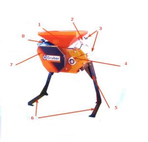 | Машина за мюсли "Gruber" 1. Широката приемна фуния създава малка височина на насипваното зърно. 2. Комплектно кабелиран триъгълен прекъсвач-звезда, защита на мотора, амперметър и стандартен щекер. 3. Просто обслужване чрез подреждане на една страна на амперметъра, промяната (настройването) на мачкащия процеп и на подаването на материала. 4. Стабилно настройване на ексцентрови валци гарантира безстепенно и точно паралелно им въртене. 5. Новата с изменяема височина стойка на машината може да се използва и като стенна конзола. 6. Широки крака на стойката със свободен достъп до работния процес. 7. Стабилен корпус за дълготрайна експлоатация. |