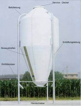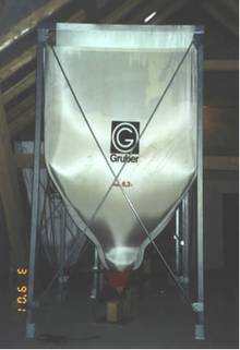 Силози от тревира «ГРУБЕР» от много здрава, еластична т. нар. "коза" - тъкан - за насипни брашнени и зърнени продукти Zubehör: Tragrahmen, Gestell, Füllleitung, Auslaufschiebe обеми от 2,1 до 17,3 т |